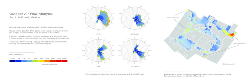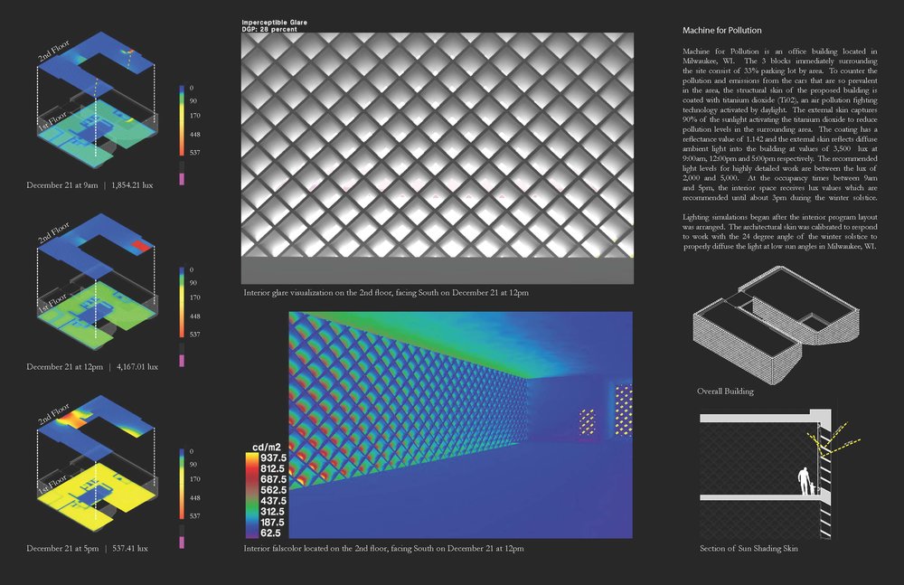 Daylight autonomy was used to see the overall performance of the design. Point-in-time illuminance was used to see the performance during specific times of the day and year, as well as to look for excess light. Radiance visualizations and false color imaging were studied to see the apparent illumination in the space and in different surfaces.