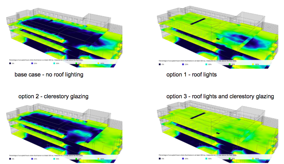 This is a visual showing 4 roof light options for a medical office building project. It compares different strategies – applying simple roof lights, clerestory glazing, both or neither. It aims to use colour to communicate which parts of the floor plate benefit from the different options.