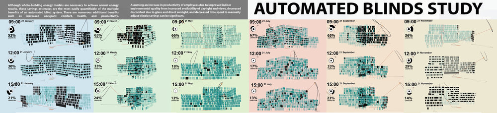 This investigation allowed us to make relative performance comparisons among a variety of blinds operation algorithms to further understand the accuracy and reliability of specific simulation methods of complicated human behavior. This ultimately resulted in some of the more interesting visualizations showing the “haphazard” manual blinds algorithms contrasted against the uniform automated blinds algorithms. And on that note, we were also able to develop some interesting ways to process and visualize daylighting, energy, and blinds operation data that we can also utilize in future investigations. Lessons learned: – Different ways of making simulation data spatial and easier to understand and communicate. – Better understand blinds as they change over time, and the algorithms used to simulate their behavior as part of the design process.