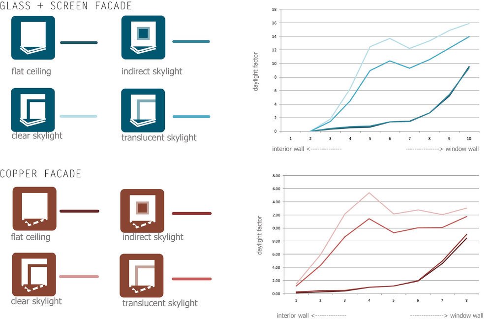 The graphic shows the effectiveness of the external skin for the office building to diffuse daylight of the summer and winter solstice to illuminate the space adequately.