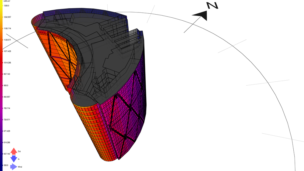 I could have opted to remove the compass (showing the North arrow) from the view as it is not visible in the current view. By orbiting around, zooming out further I could have navigated the 3D model view whereby the North arrow information could have been useful to the graphic output. Accompanying the data with an indication of peak air velocities would have provided context to the feasibility of naturally ventilating the building.