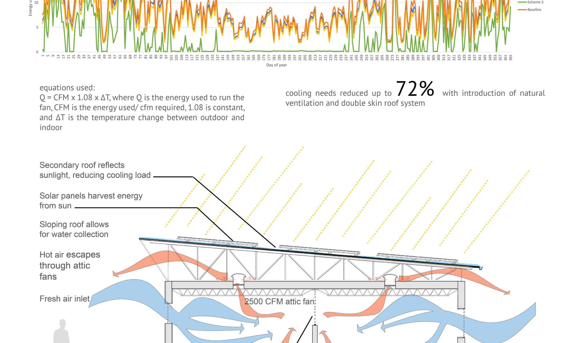 What is the impact of Natural Ventilation and Double Skin Roof Systems on energy needed for cooling?