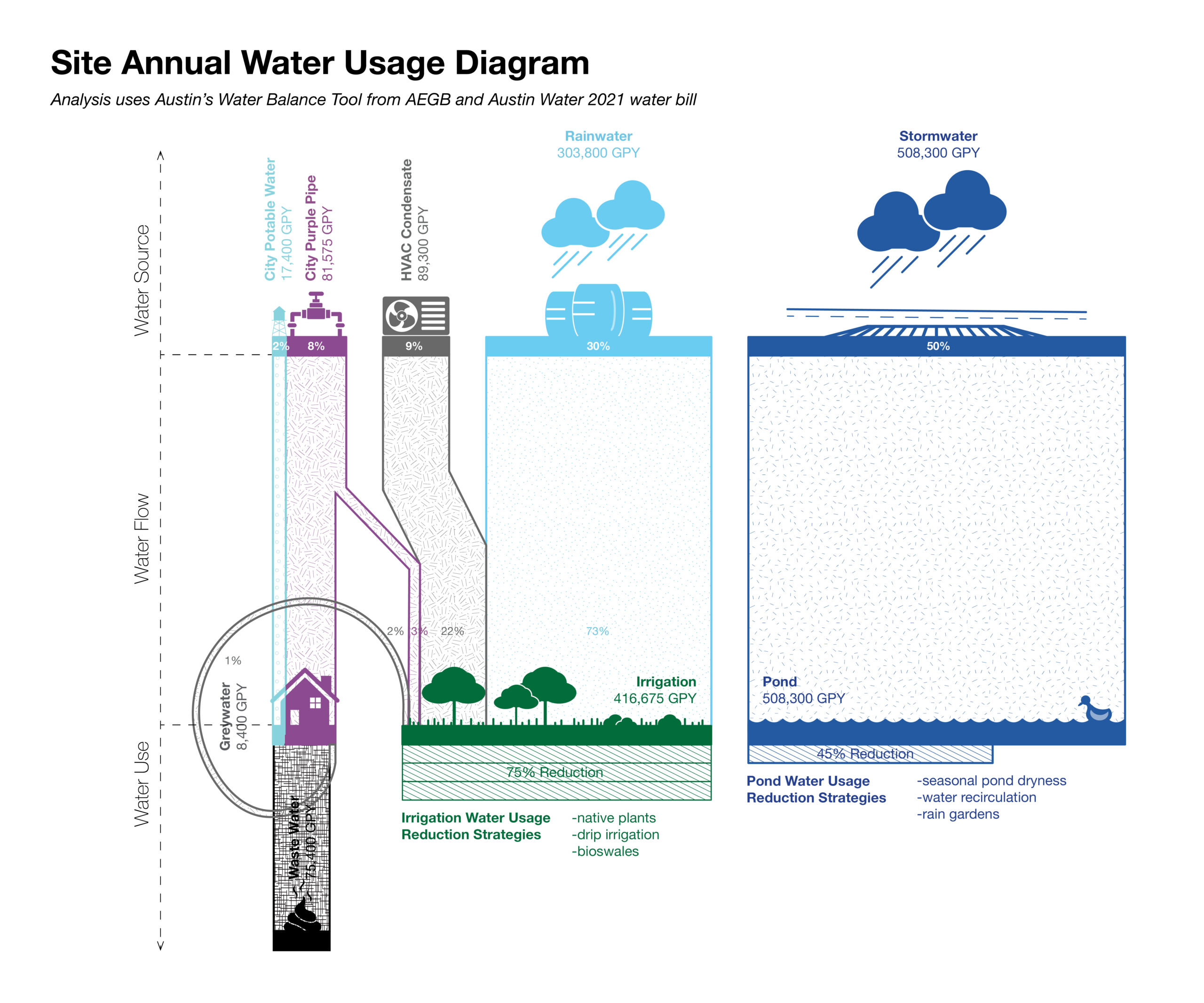 What is the impact of alternate water sources and reduction strategies on the site’s total gallons of freshwater consumption?