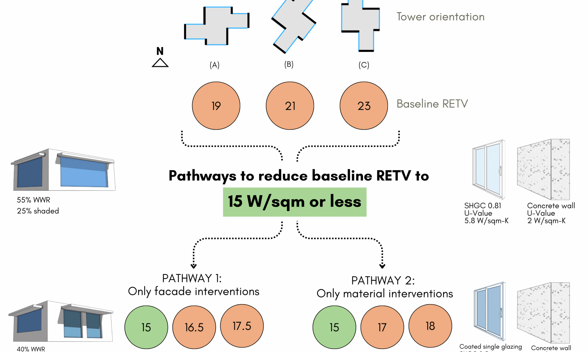 What is the impact of facade and material interventions on Residential Envelope Transmittance Value (RETV) for a high-rise residential building in a warm-humid climate?