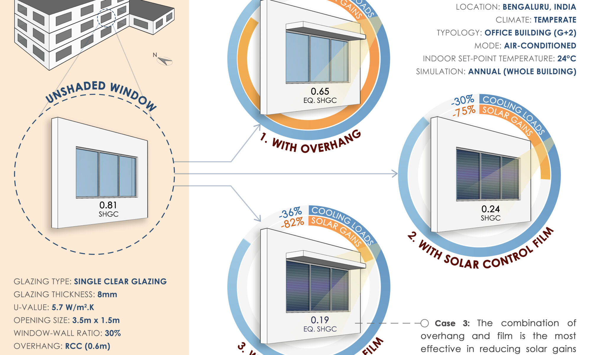 What is the impact of Different glazing SHGC on Cooling loads, Solar gains and cost of material for an office building in composite climate??