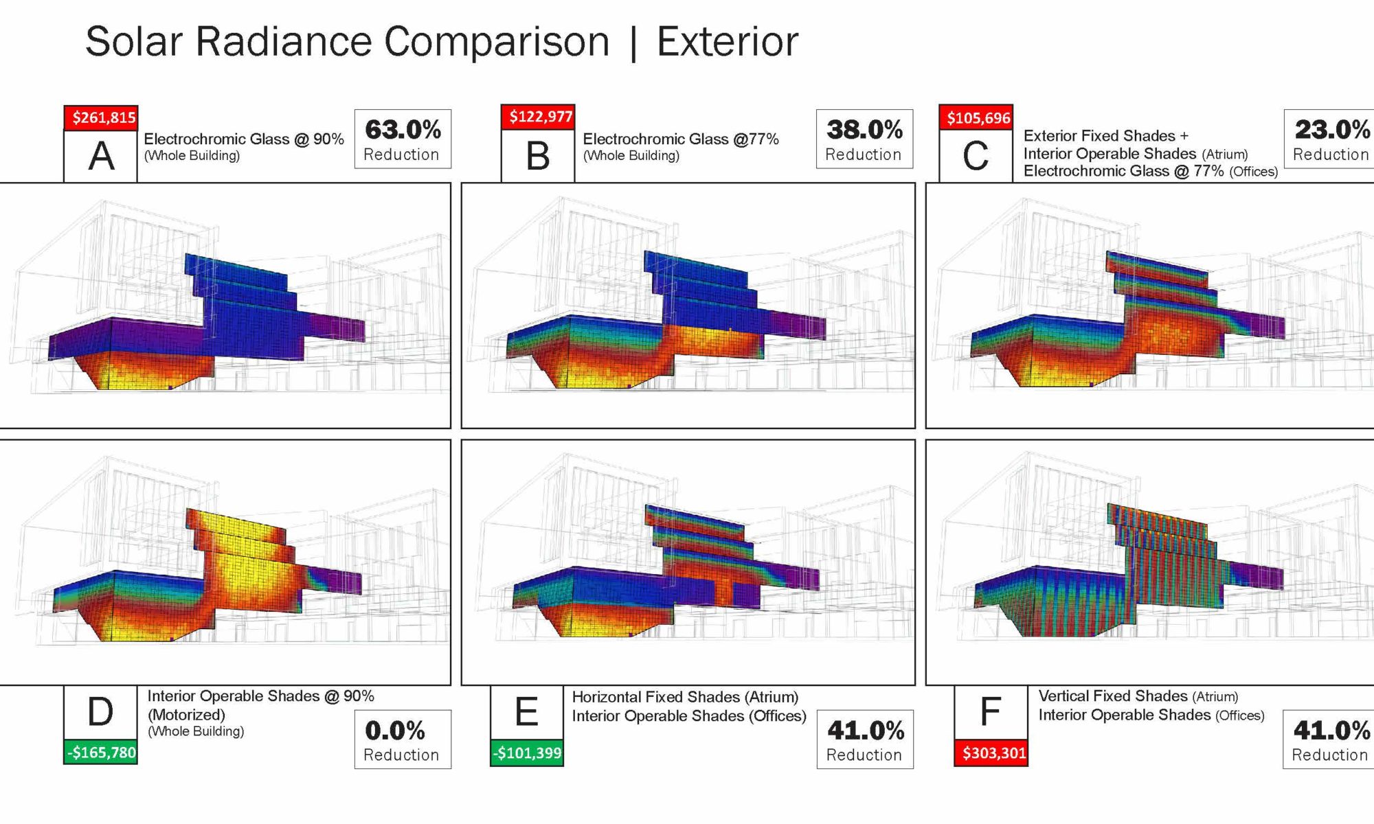 What is the impact of various shading strategies on building energy use and mechanical savings??