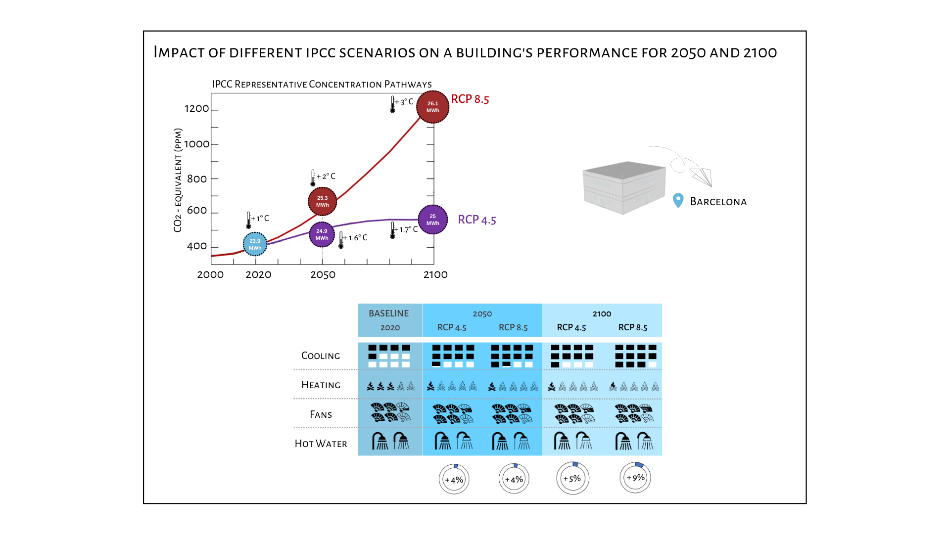 What is the impact of different IPCC scenarios on a building’s performance for 2050 and 2100?