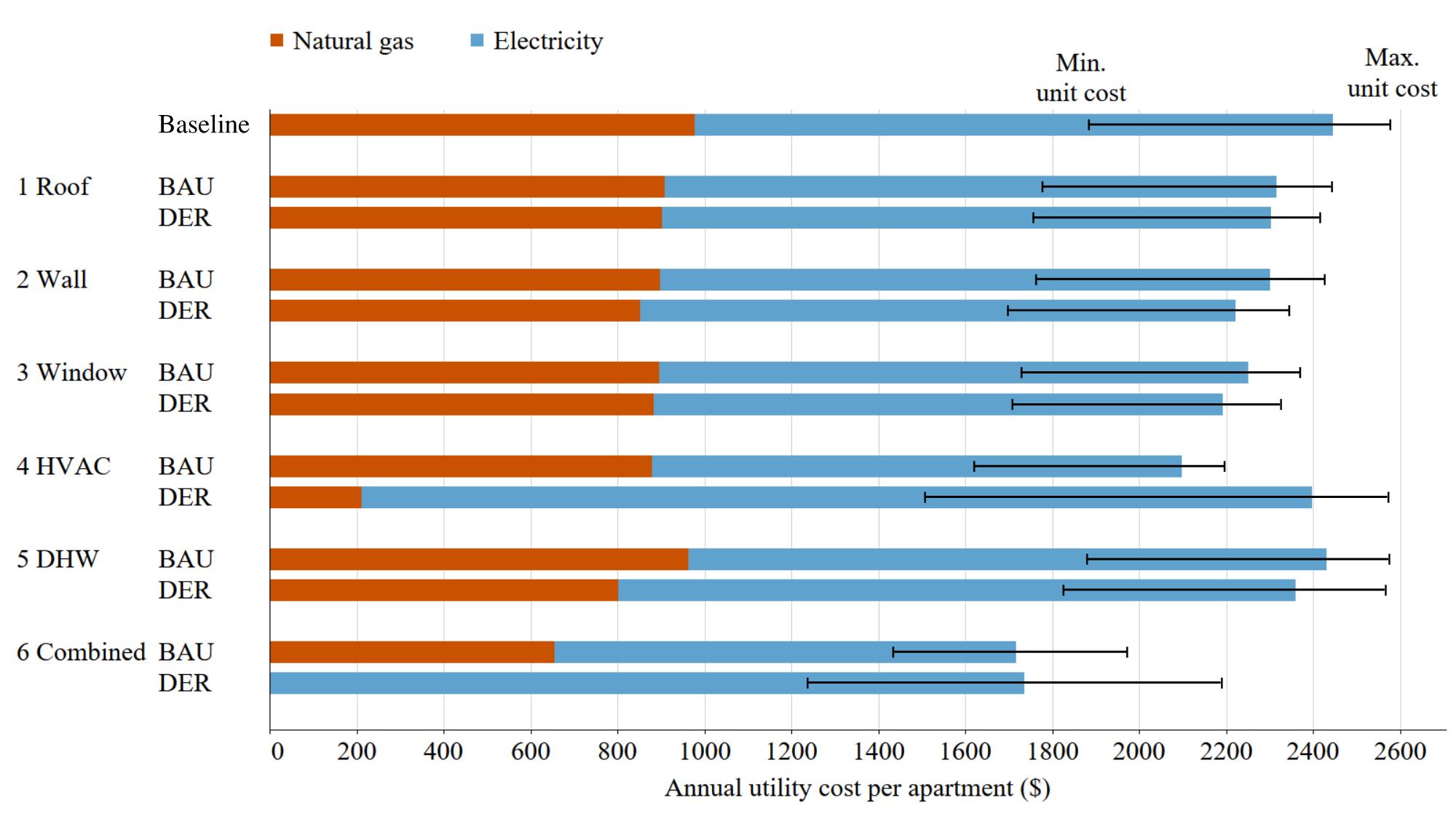 What is the impact of of deep energy retrofits (DER) vs. business-as-usual retrofits (BAU) on annual utility cost in a low-rise multifamily apartment?