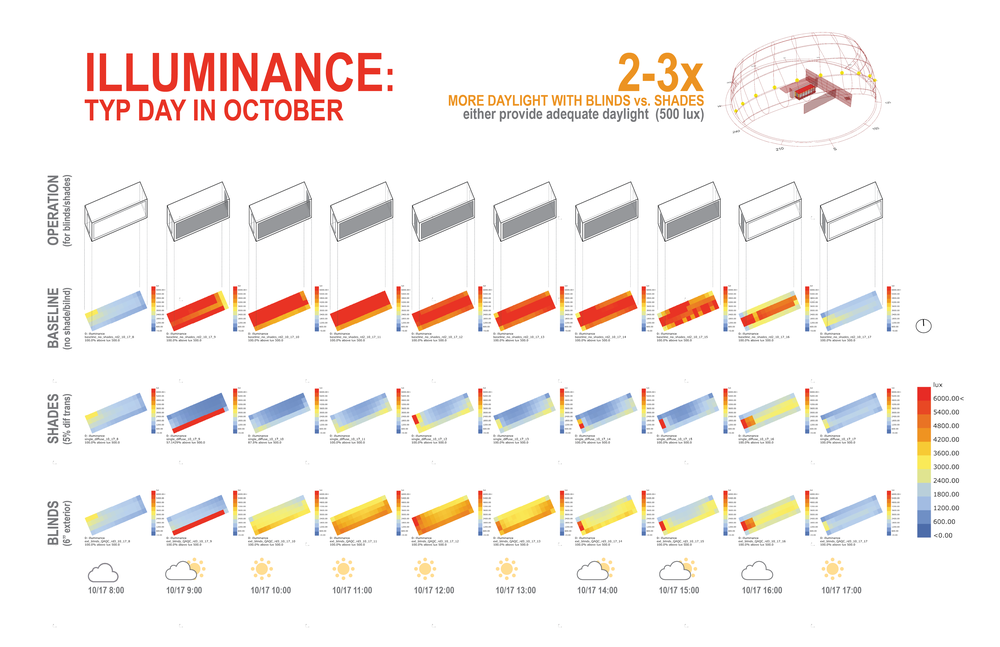 What is the impact of blind control strategies on illuminance over the course of an October day?