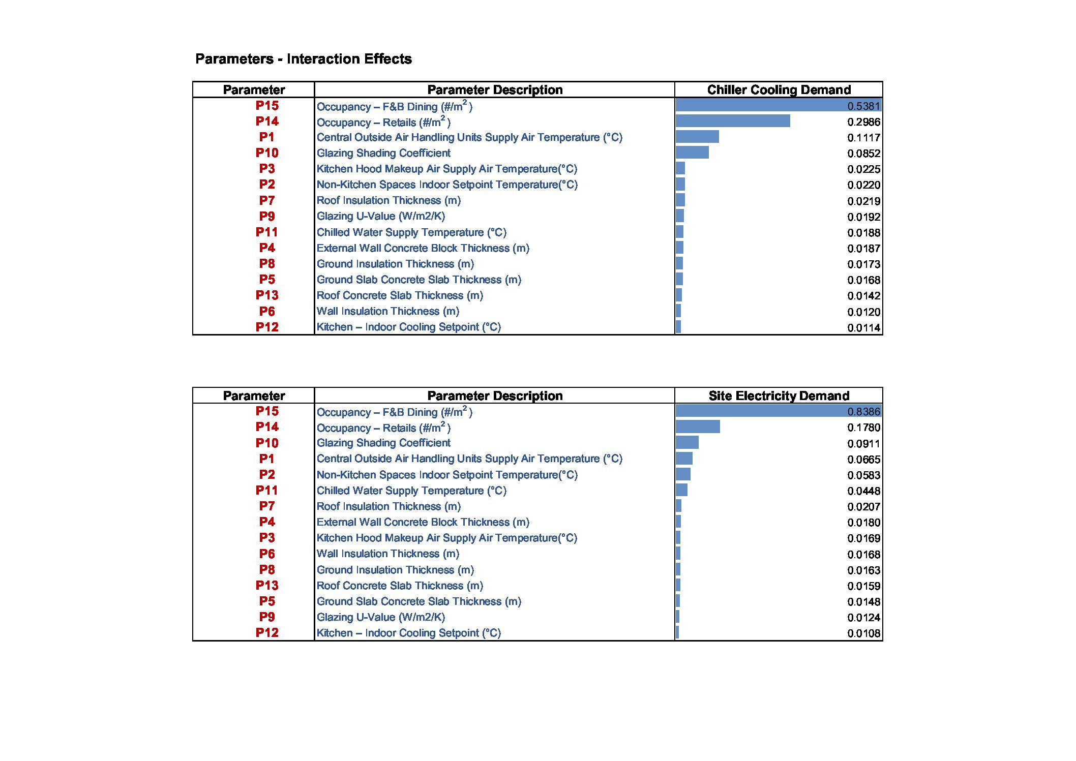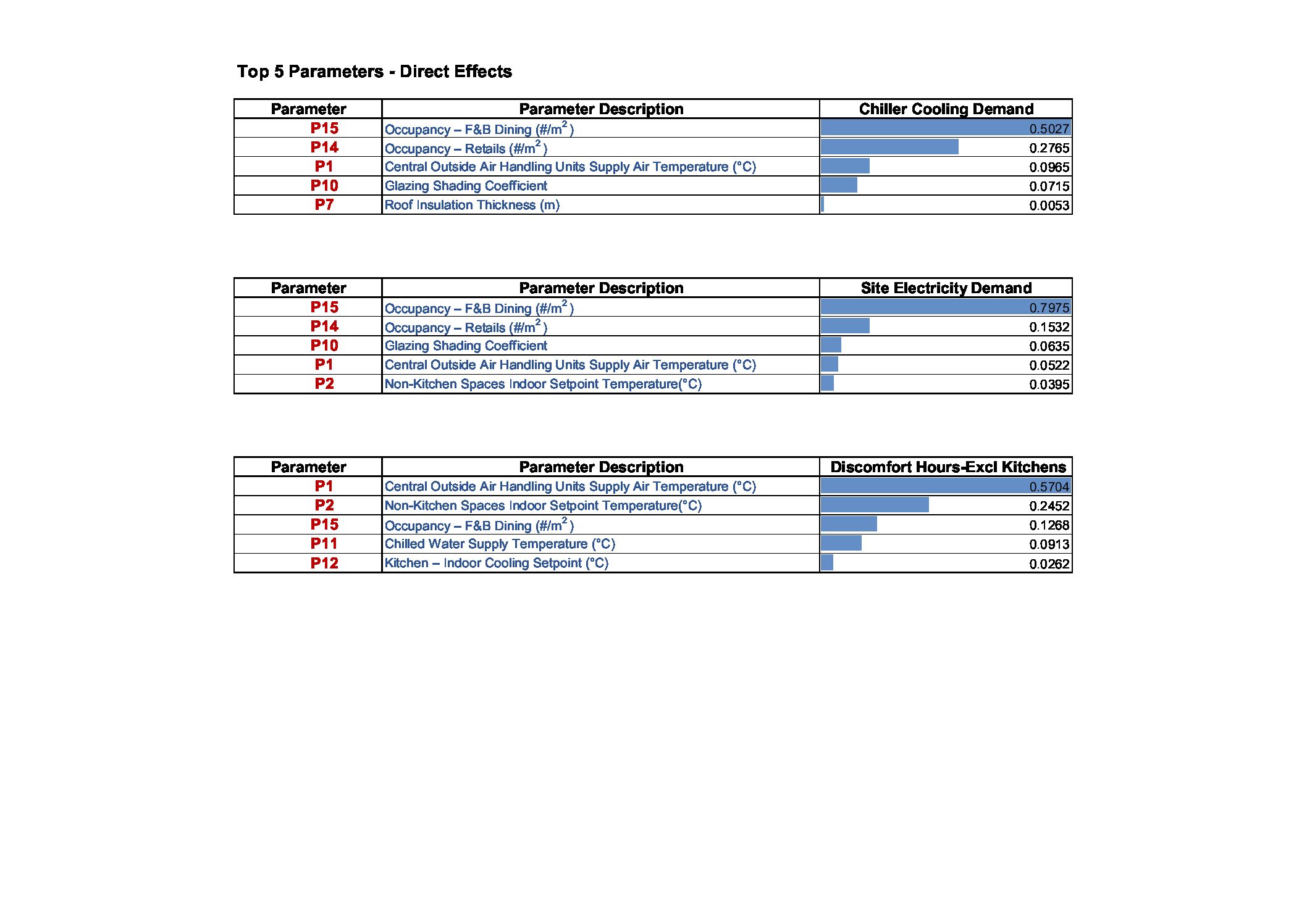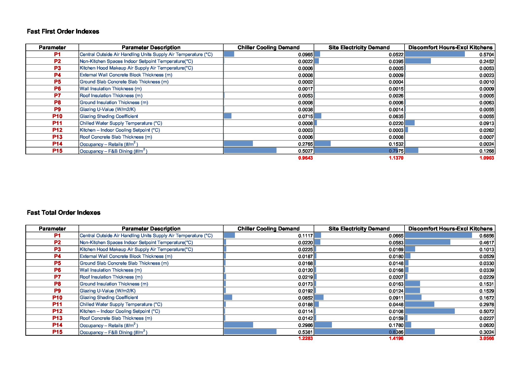 Extended FAST variance method is chosen to study the effect of the input parameters to the output (cooling load, electrical demands and thermal comforts) variances. Based on the sensitivity analysis, all the parameters are ranked for cooling demands, electricity demands and thermal discomforts. The Ranking of parameters enables the design team to address key parameters in the design for low energy consumptions. In this casestudy, the outputs of the sensitivity analysis are visualised using tornado plots and outputs of total simulations are plotted for direct searches , meta model developments (MLR). In the variance-based method, two main sensitivity measures are quantified namely first order and total order effects. The first order quantifies the main direct effects of the output variations due to the corresponding input parameter. Total order effects include quantifications of variations in the output due to the total contributions of first order and higher order effects by their interactions. So the difference between first and total order gives the measure of the interactions between input parameters.