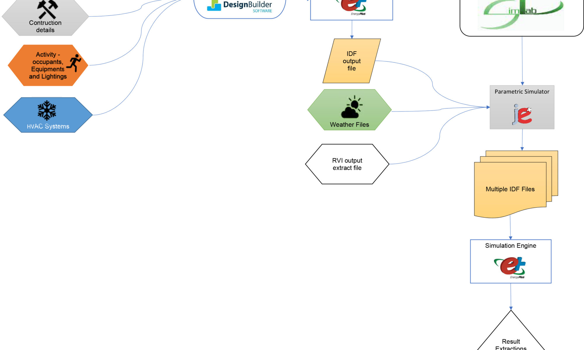 As the Casestudy requires to study the effects of various parameters it requires varying them parametrically to study the output from the building simulation programs, so it is prefered to use text input and text output type BPS programs. With text-based BPS programs, the pre-processing and post-processing can be done more efficiently by custom-made scripts as per user requirements. Building models and HVAC system models are modelled in DesignBuilder software and the Input Data File (IDF) exported from them are used for parametric simulations. For the Parametric simulations, the job lists or multiple IDF files are created using SIMLAB and jEplus tools. The output files from the multiple simulations are extracted using custom based scripts. The Outputs from each input’s combination are used to rank the input parameters using Sensitivity Analysis. The Complete workflow is illustrated in the Methodology flow chart. Big data from the simulations can also be used for direct searches, optimisation tools, Metamodel developments to simplify urban simulations model simulations.