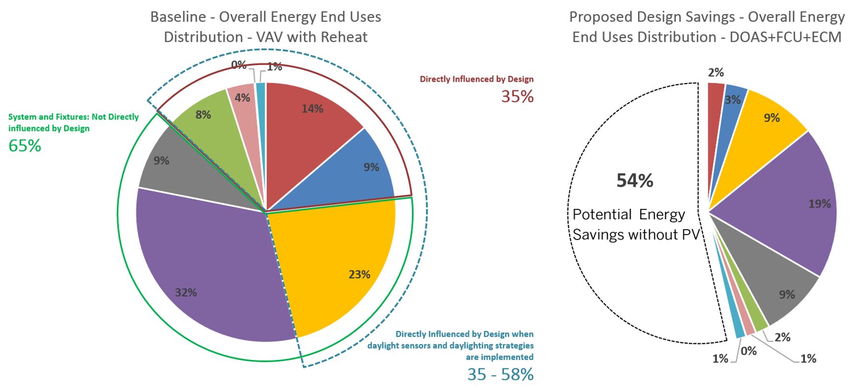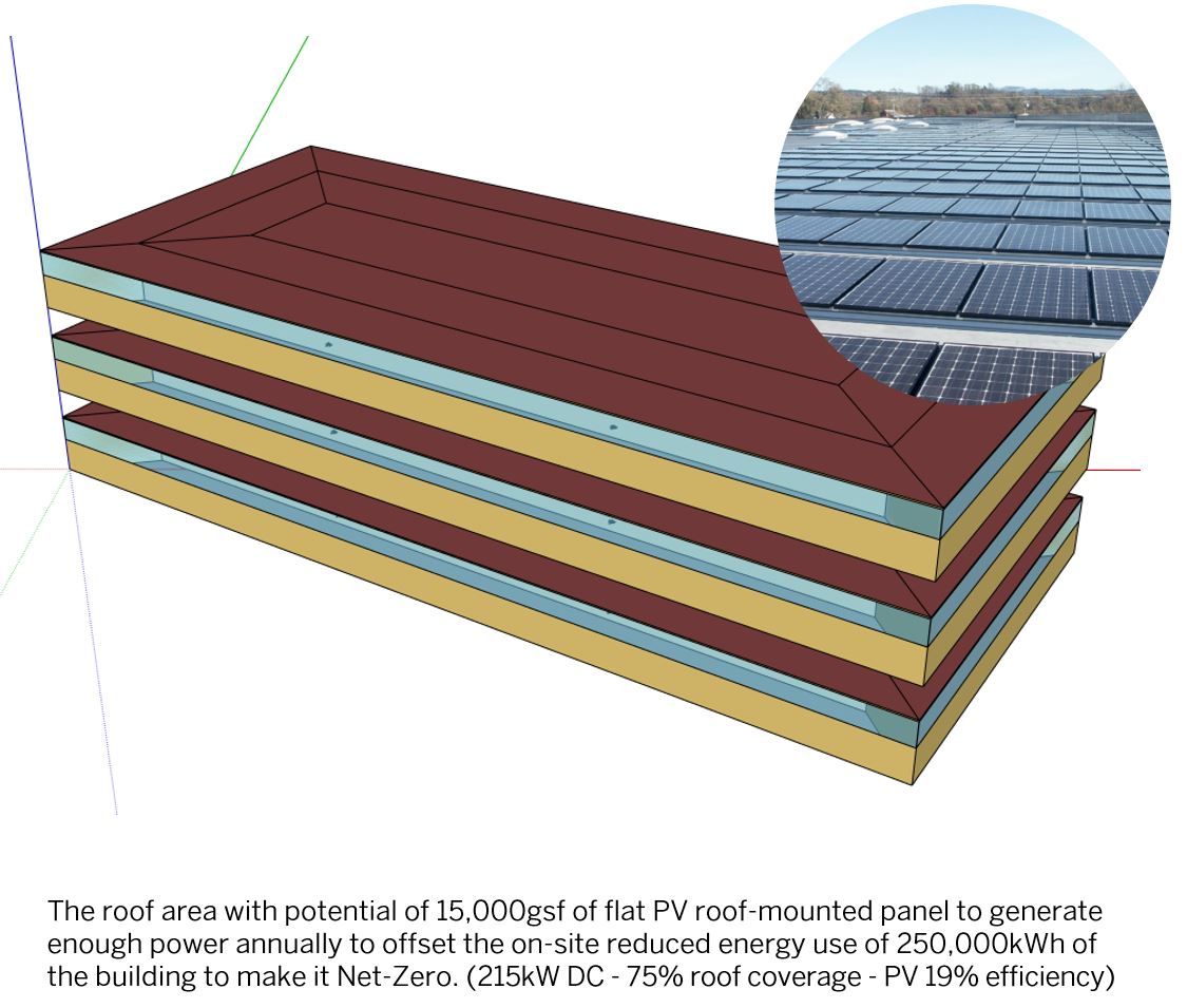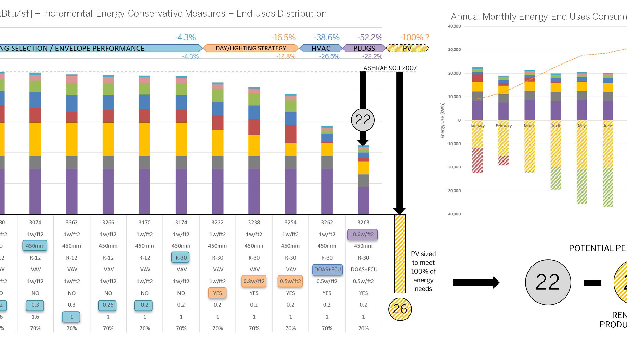 The results were shown on a power point. The unique aspect of the graphic shows at the bottom of the chart laying out each design option changes and showing at the top the % of energy use reduction. The pie diagram informed as a primer that 35% of the pie could directly be influenced by the design itself, whereas 65% would be more influenced by the systems. Once the energy use was reduced to a minimum, the last chart on the bottom right shows how on a month basis PV panels flat mounted on the roof can contribute to electricity-generating with some month producing more than necessary to offset energy consumption, especially the summer month where the sun angle radiations are more vertical. The colder months would naturally have less energy production but overall the project could show a potential of positive energy generation if the roof area was to be maximize with PV coverage up to 75%.