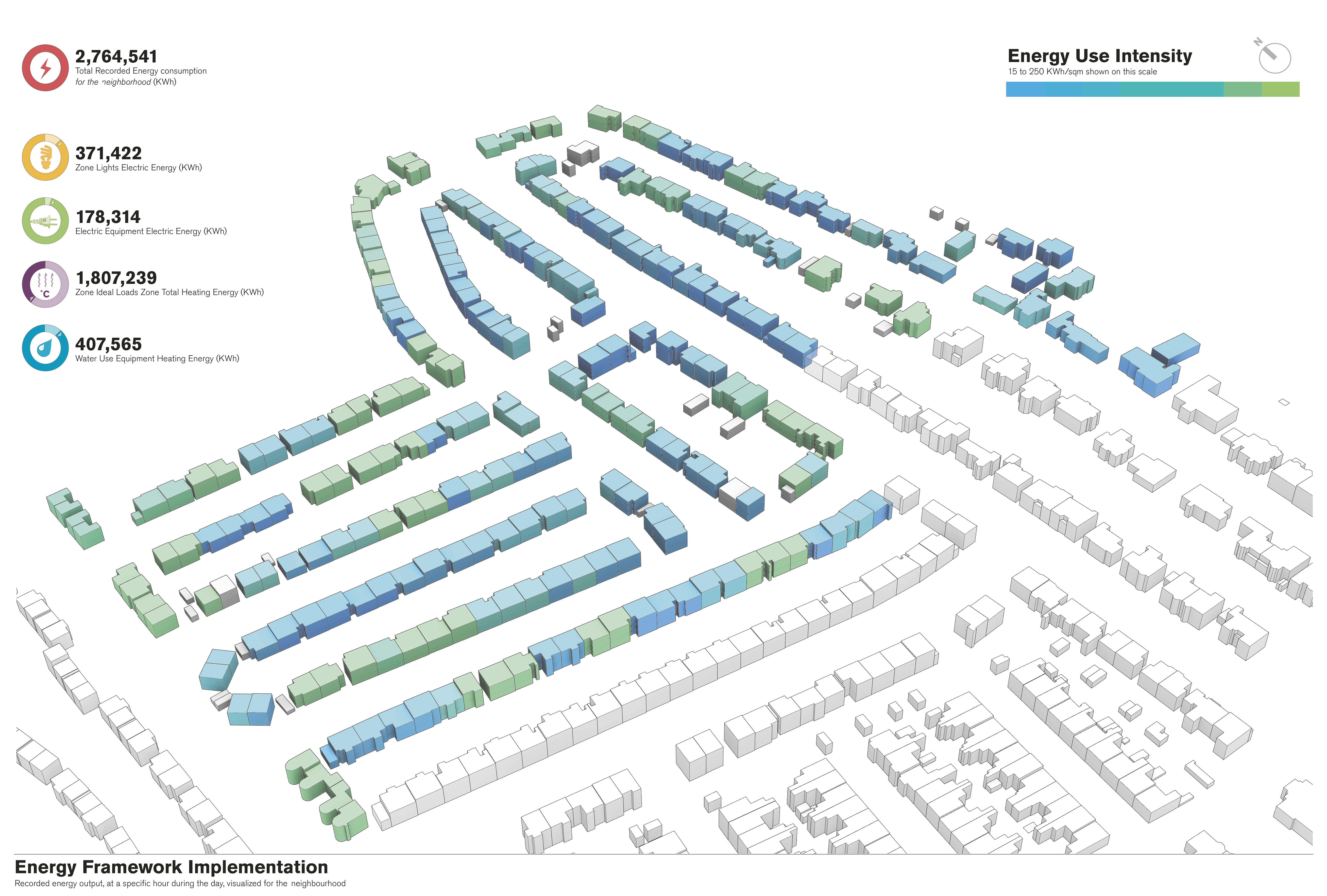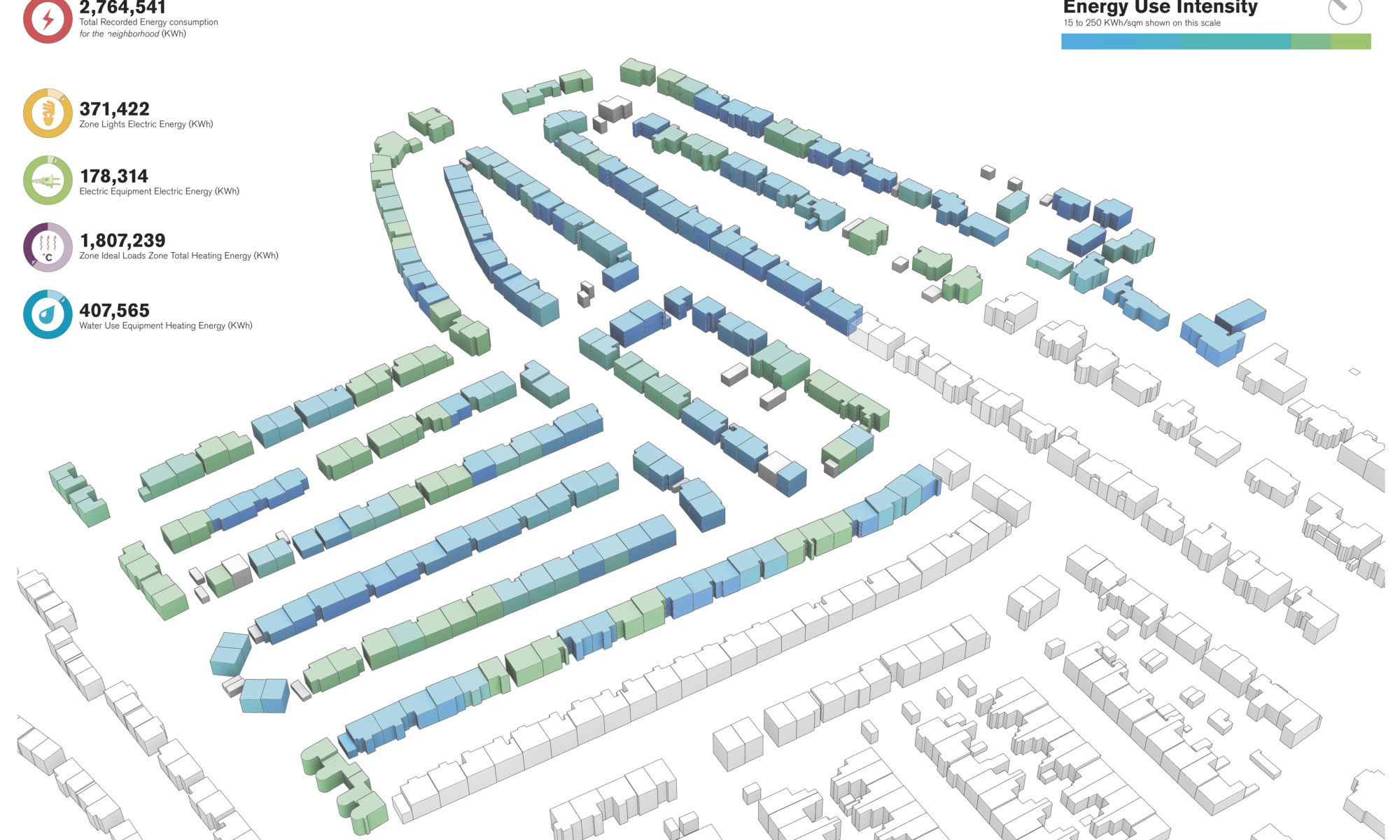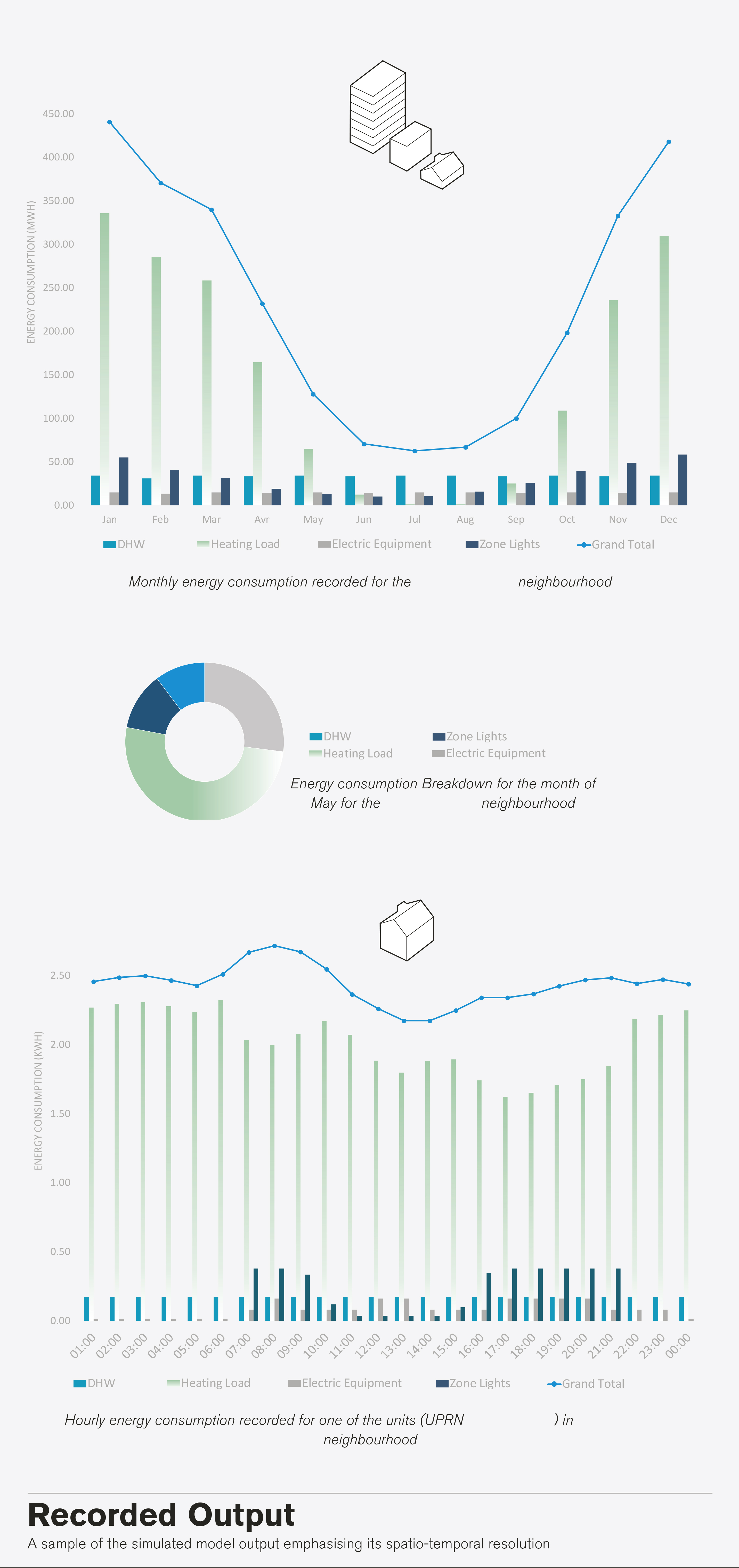 Most importantly, what did you learn from the investigation? How did the simulation and its outputs influence the design of the project? Large urban building datasets are confusing, yet, highly valuable. The presented work dilutes this data in a comprehensive modelling framework, a framework that helps to scrutinise energy consumption patterns of the existing urban building stock. The framework results in a tool of low complexity, high reliability and suitable for multi-scale energy analysis on a neighbourhood/ LV substation area scale. The framework spans not only different disciplines but also the levels and system boundaries of analysis. What mainly characterise the designed framework is the following: a) Urban context sensitive: the modelling takes the influence of urban context into account; b) Urban data-driven: the modelling framework input utilizes abundant publicly accessible urban data to inform building energy modelling; c) Four different streams of simulated energy consumptions: Lighting, electrical equipment, heating, and domestic hot water; d) GIS and Grasshopper based: it is based on widely used software by planners and architects which makes it easier for people with non-programming background to run the model and visualize the results; f) Resolution controlled: the temporal resolution of the modelling could be changed to provide hourly, daily, weekly, monthly or annual building energy use results. Also, high spatial resolution is emphasised as results can be read at a building, group of buildings and neighbourhood scales; g) Results validated against open-sourced empirical data and peer energy models with an acceptable overall range of error (C. Reinhart & C. Davila, 2015); h) The recorded output is in CSV format which then feeds into the original XML building input data; thus, allows for model calibration; i) Final results are illustrated in a user-friendly graphical output which can capture the Spatio-temporal resolution of the designed energy modelling framework. This is likely to make the design decision making more efficient as multiple stakeholders, even non-scientific audiences can digest the complex simulated data. The outcome of this work paves the way to empower planning teams with methods and tools necessary to understand patterns of energy use and to define policies/guidelines in order to improve the efficiency of the existing building stock. Also, to support local decision-makers with methods and tools to investigate the feasibility of potential urban energy scenarios to build the city of tomorrow. Example scenarios include optimised demand-response, building stock envelope retrofit, renewable energy generation potential, power infrastructure retrofit, heat electrification, and others. Future research should aim to improve the integration of urban power infrastructure within the designed energy modelling framework. Another space for improvement includes the integration of microclimatic effects. One way to achieve this is by linking Envi-met (another grasshopper plugin) to the simulation set-up workflow. Worth mentioning that the framework as designed applies to UK neighbourhoods, and further work is required to re-adjust the framework to publicly available urban data in other cities and countries. We have many life responsibilities, contributing to planning the city of tomorrow is one of them.