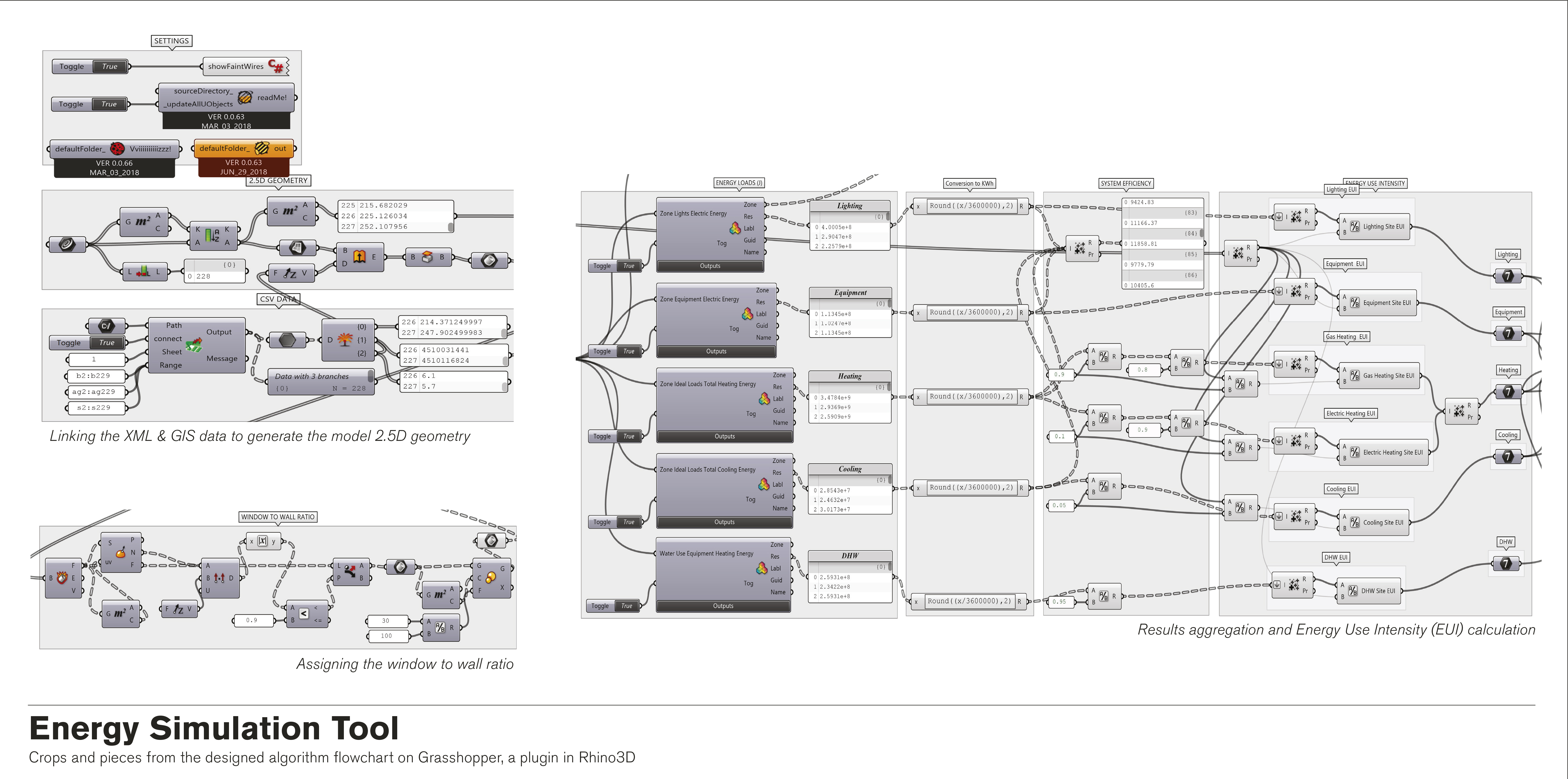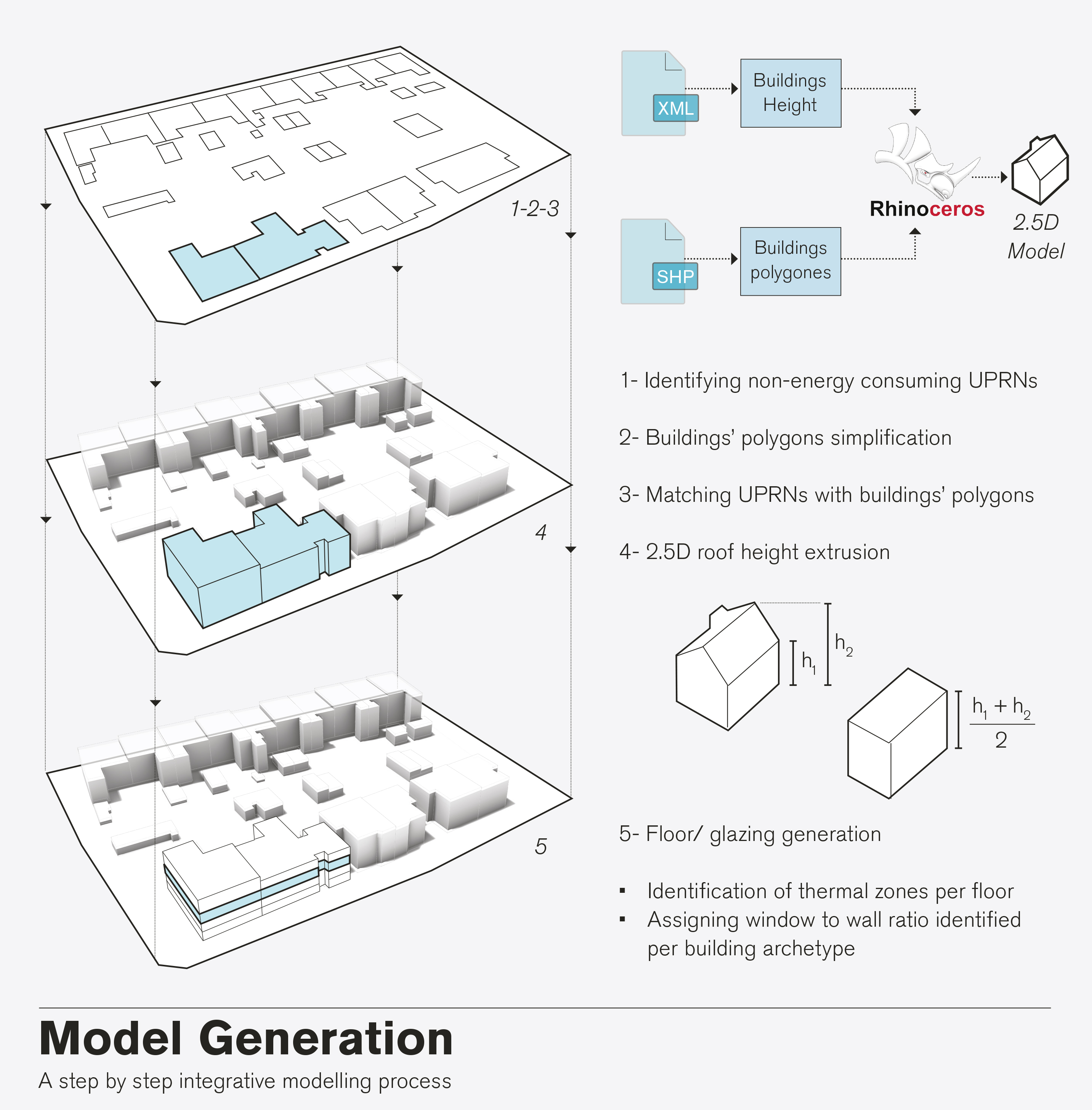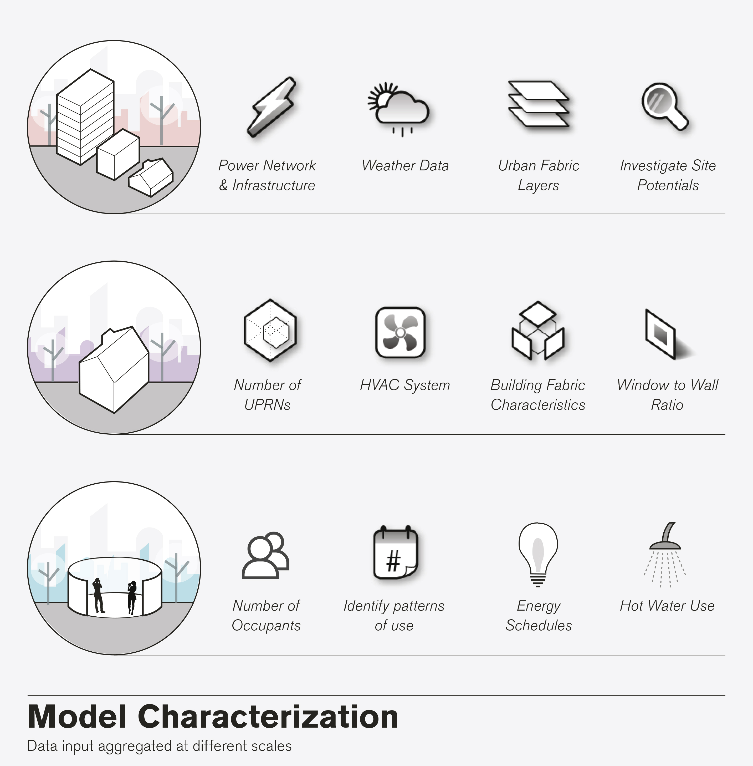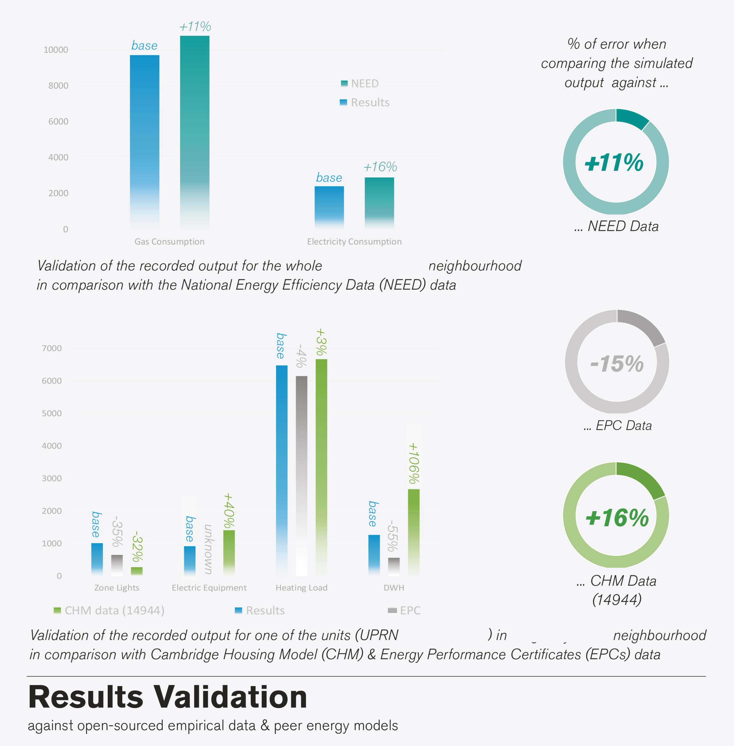 Most importantly, what did you learn from the investigation? How did the simulation and its outputs influence the design of the project? Large urban building datasets are confusing, yet, highly valuable. The presented work dilutes this data in a comprehensive modelling framework, a framework that helps to scrutinise energy consumption patterns of the existing urban building stock. The framework results in a tool of low complexity, high reliability and suitable for multi-scale energy analysis on a neighbourhood/ LV substation area scale. The framework spans not only different disciplines but also the levels and system boundaries of analysis. What mainly characterise the designed framework is the following: a) Urban context sensitive: the modelling takes the influence of urban context into account; b) Urban data-driven: the modelling framework input utilizes abundant publicly accessible urban data to inform building energy modelling; c) Four different streams of simulated energy consumptions: Lighting, electrical equipment, heating, and domestic hot water; d) GIS and Grasshopper based: it is based on widely used software by planners and architects which makes it easier for people with non-programming background to run the model and visualize the results; f) Resolution controlled: the temporal resolution of the modelling could be changed to provide hourly, daily, weekly, monthly or annual building energy use results. Also, high spatial resolution is emphasised as results can be read at a building, group of buildings and neighbourhood scales; g) Results validated against open-sourced empirical data and peer energy models with an acceptable overall range of error (C. Reinhart & C. Davila, 2015); h) The recorded output is in CSV format which then feeds into the original XML building input data; thus, allows for model calibration; i) Final results are illustrated in a user-friendly graphical output which can capture the Spatio-temporal resolution of the designed energy modelling framework. This is likely to make the design decision making more efficient as multiple stakeholders, even non-scientific audiences can digest the complex simulated data. The outcome of this work paves the way to empower planning teams with methods and tools necessary to understand patterns of energy use and to define policies/guidelines in order to improve the efficiency of the existing building stock. Also, to support local decision-makers with methods and tools to investigate the feasibility of potential urban energy scenarios to build the city of tomorrow. Example scenarios include optimised demand-response, building stock envelope retrofit, renewable energy generation potential, power infrastructure retrofit, heat electrification, and others. Future research should aim to improve the integration of urban power infrastructure within the designed energy modelling framework. Another space for improvement includes the integration of microclimatic effects. One way to achieve this is by linking Envi-met (another grasshopper plugin) to the simulation set-up workflow. Worth mentioning that the framework as designed applies to UK neighbourhoods, and further work is required to re-adjust the framework to publicly available urban data in other cities and countries. We have many life responsibilities, contributing to planning the city of tomorrow is one of them.