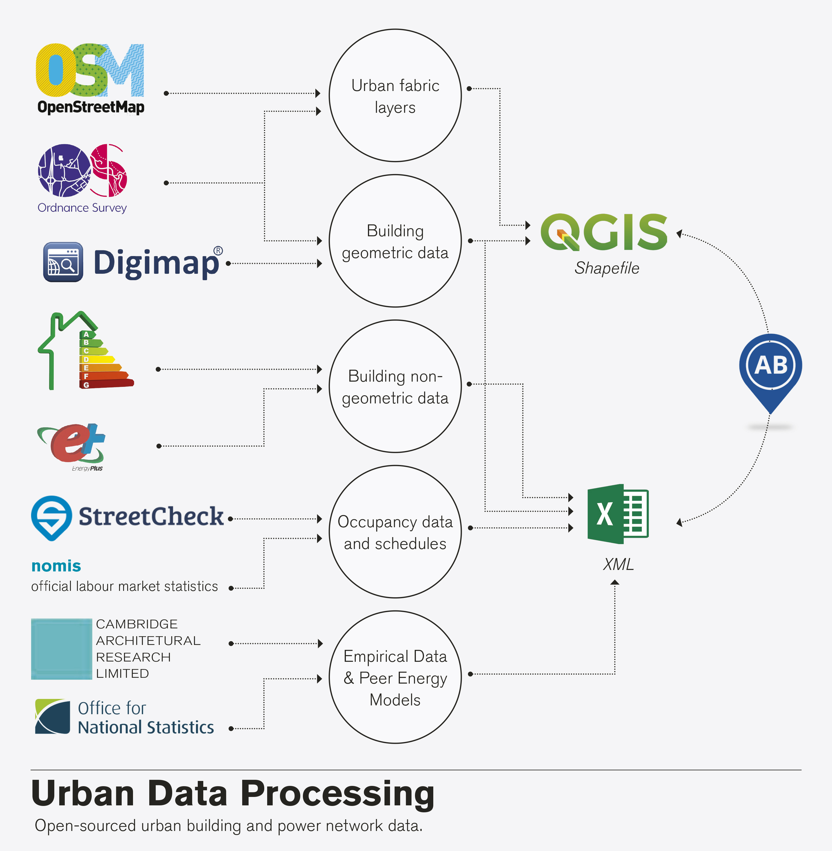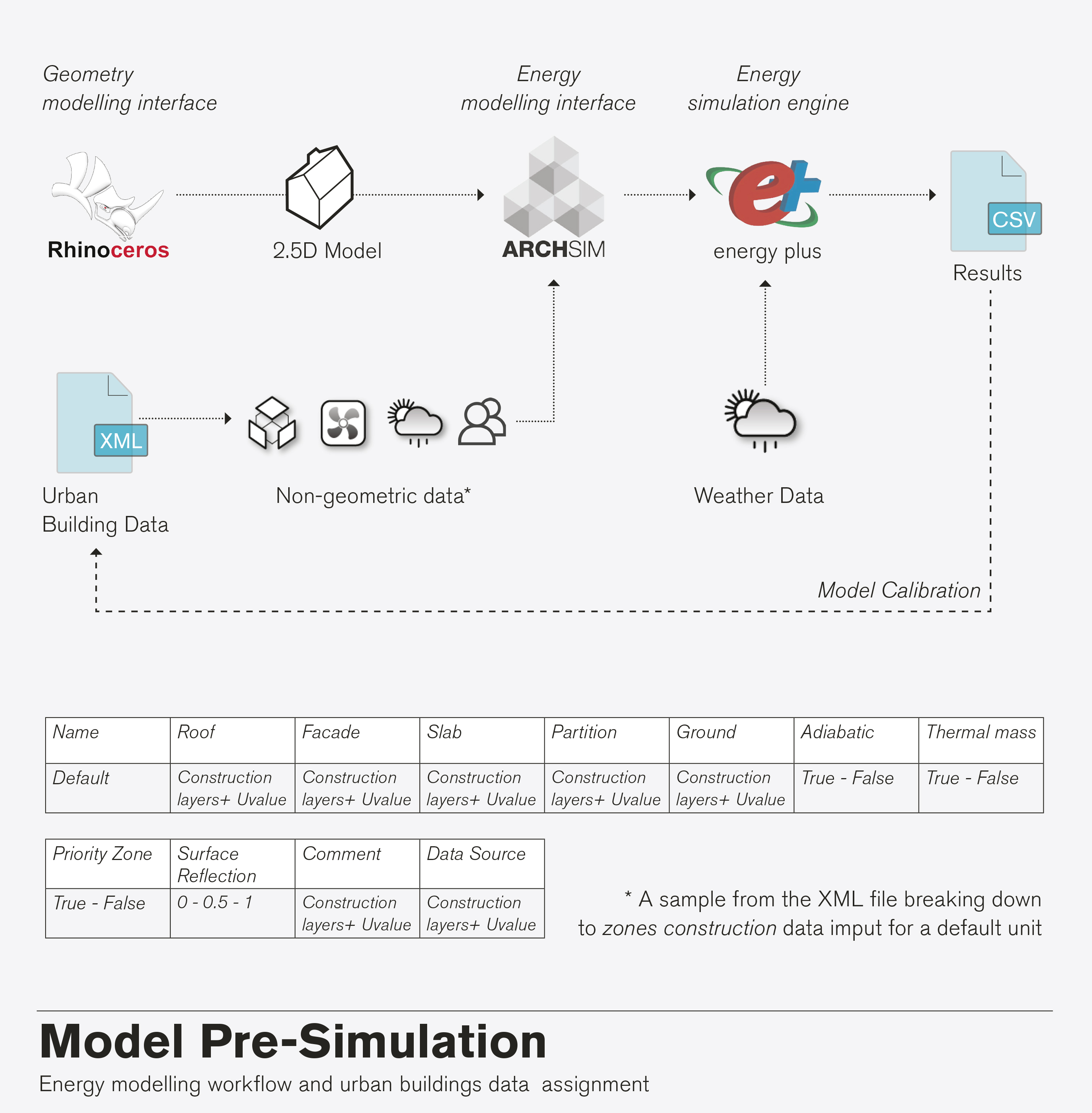 The energy modelling framework was tested on a low voltage substation neighbourhood of 248 domestic buildings located in north-east England, UK. The recorded output was then validated against open-sourced empirical data and peer energy models with an acceptable overall range of error (C. Reinhart & C. Davila, 2015). Predominantly the proposed modelling system runs on the Grasshopper platform, mainly honeybee, ArchSim, and energy plus. Complementary used platforms are QGIS 2.18, and Microsoft Excel. The proposed modelling framework is relatively user-friendly and supposedly can be used by a non-programmer. However, basic knowledge of the programmes in use is required. The methodology distinguished between several steps necessary to set up the simulation analysis: urban data processing, model characterization, model generation, model pre-simulation, energy simulation tool, results validation and in the end model calibration. The model system uses urban data from various publicly accessible sources as its input, integrates and refines them into a new dataset essential for the pre-simulation model, provides the resulting data to the main simulation model, then visualises, validates and allow calibration of the simulated energy output. The modelling system structure and its data flow diagram is depicted in the attached images.