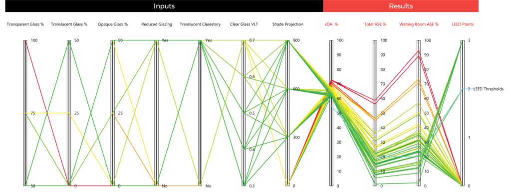 The graphic is showing the parametric study of façade alternatives that utilize different combinations of protective shading and translucent or spandrel glass to reduce the annual sunlight exposure (ASE) down to levels acceptable by LEED v4.0. A ghosted model of the each façade configuration is shown along with the ASE plot of the interior. Together, the two elements of the image show the design options iterating and how reducing the transparent glazed area and providing solar shading reduced the area with more than 250 hours of ASE down to levels acceptable by LEED v4.0. The challenge of reducing ASE to acceptable levels in such a shallow space with a high degree of west facing glazing was illustrated by the study since many of the configurations studied still not reduce the ASE level far enough to achieve the credit. Yet by combining different strategies, such as replacing some clear glazing with translucent, varying the VLT of the glazing, and introducing exterior shading, the ASE can be reduced enough to be below the threshold for maximum affected area. The parallel coordinates plot shows that there are actually a few different pathways that will work to meet the target, but that a higher VLT glass will require additional shading, or that the length of the shading can be reduced with more protective glass.