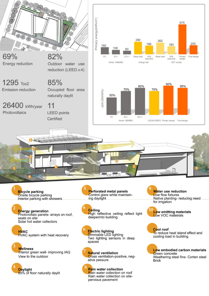 The graphic is a design process of a student center with about 2100 occupants in a university. There are three main design levels: analyzing climate and passive strategies opportunities, schematic design, and detail design. In each level nine alternatives have been simulated and analyzed and the results in several aspects are compared. the best options are selected and the final results are reported based on INBR(Iran National Building Regulation), LEED, Energy Star, and RET screen.