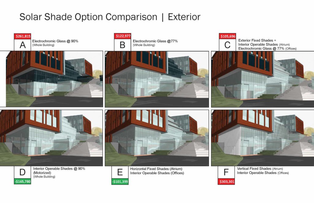 This graphic shows an analysis of various solar shading strategies using a radiance grid overlaid on 3D building massing as well as details on the EUI reduction and Mechanical cost.