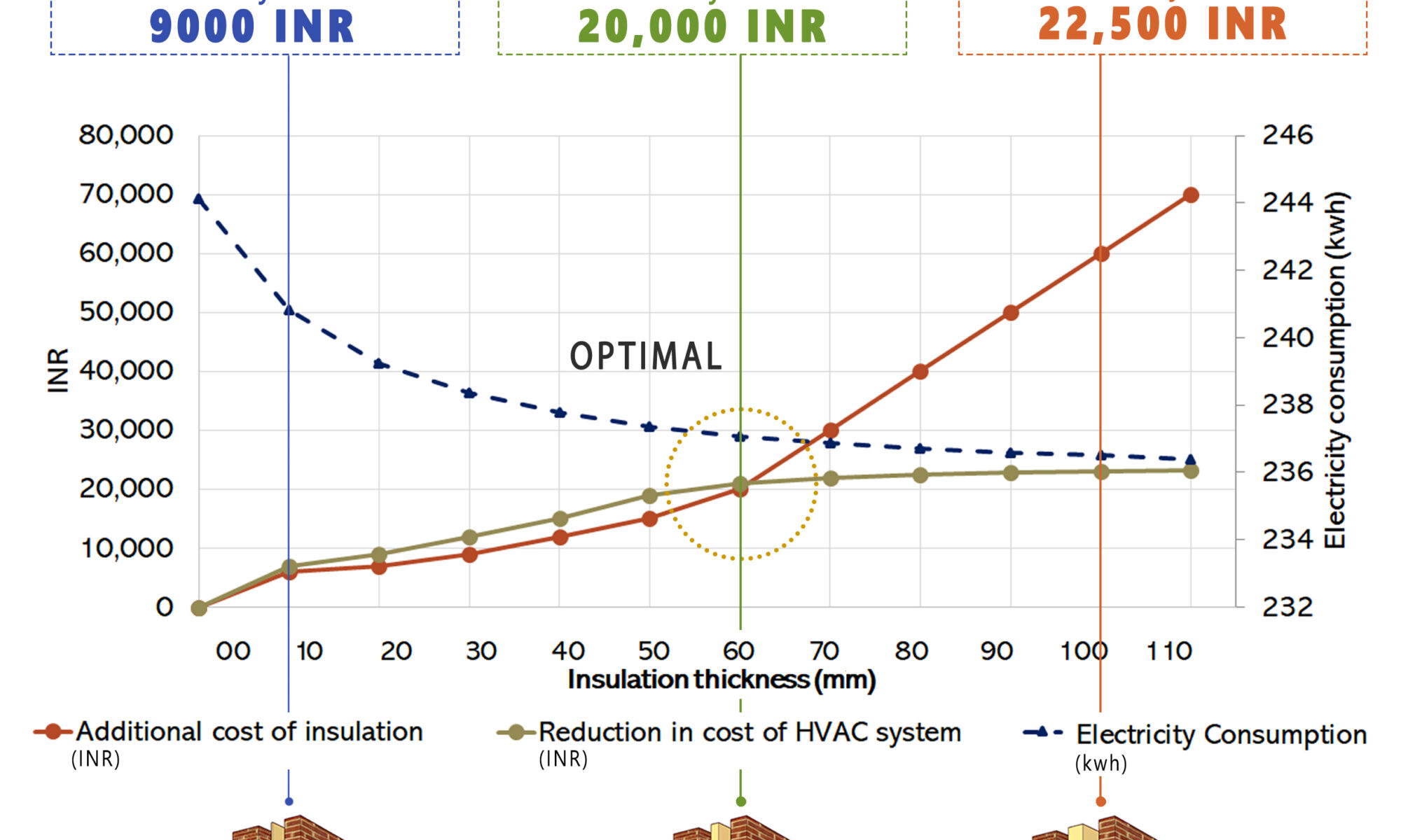 What is the impact of Insulation thickness on Electricity consumption, Reduction in HVAC system size and additional cost of insulation?