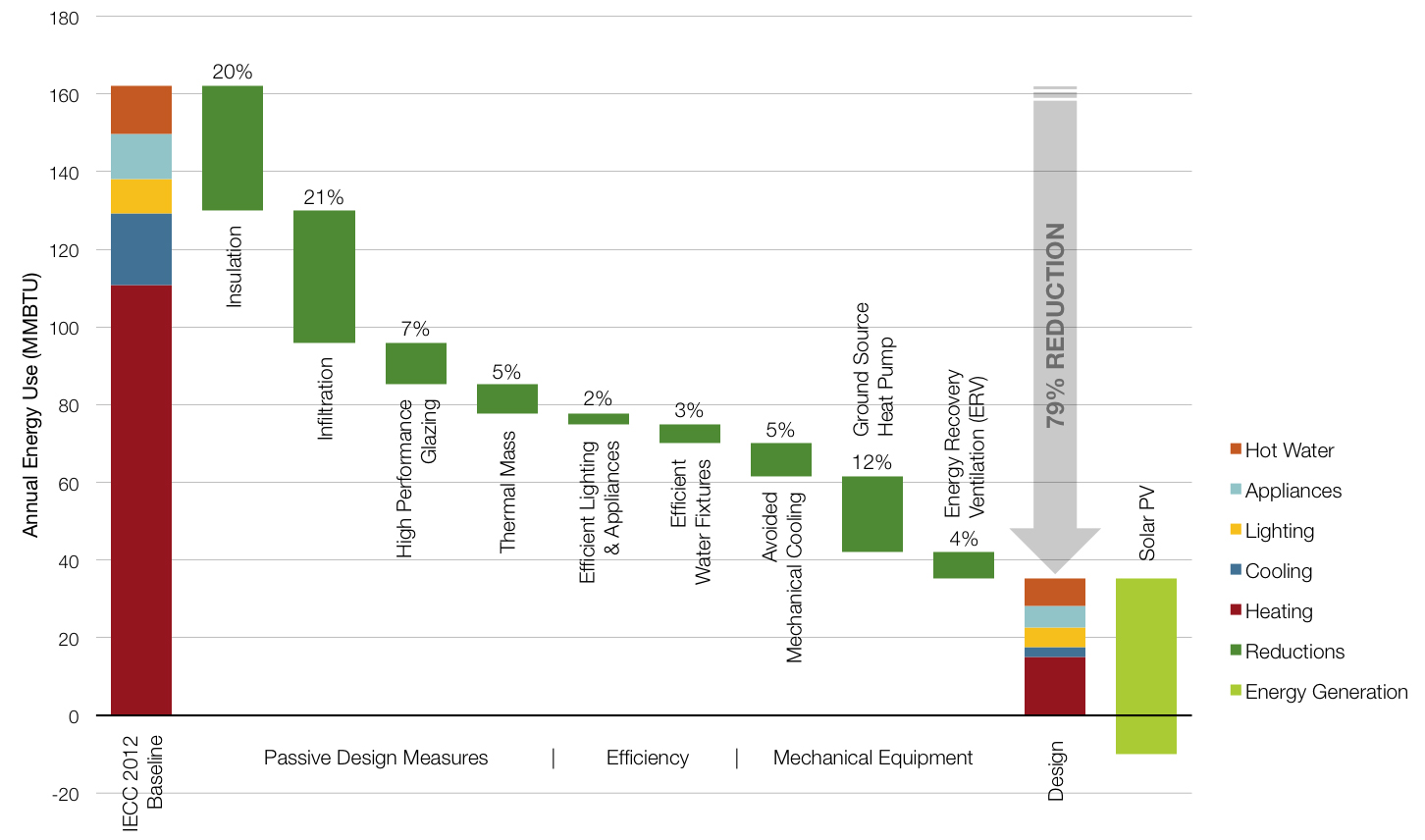 The graphic is answering the question “What combination of strategies gets the project to Net Zero Energy?” in a way that is accessible to a non-specialist audience. It begins with a code baseline case, showing the predicted annual energy use and end use breakdown of a new home built to IECC 2012 standards. It then shows reductions in energy use achieved by implementing a series of strategies, starting with passive measures, then efficient lighting & appliances, and finally efficient HVAC systems. The idea is to show both the relative importance of different measures, but also how, step by step, they add up to a significant reduction. The arrow above the Design Case highlights the overall reduction from the baseline. The Design Case is broken down by energy end uses to facilitate comparison to the baseline. Finally, the graphic shows the estimated on-site PV potential, which dips below the x-axis to show the potential for Net Positive Energy.