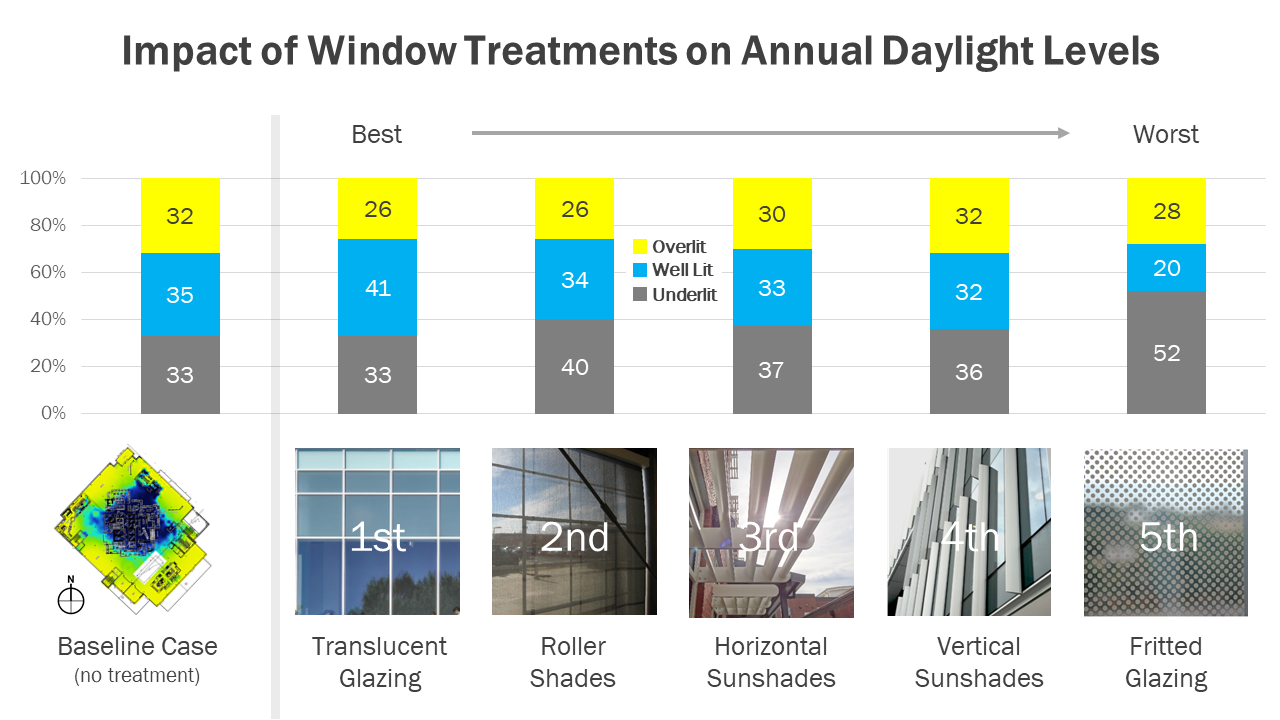 - Which window treatments will result in the best and worst daylight performance (as measured by Well Lit floor area)? - Which options will result in significantly less daylight (as measured by Underlit area) and/or glare (as measured by Overlit area)?