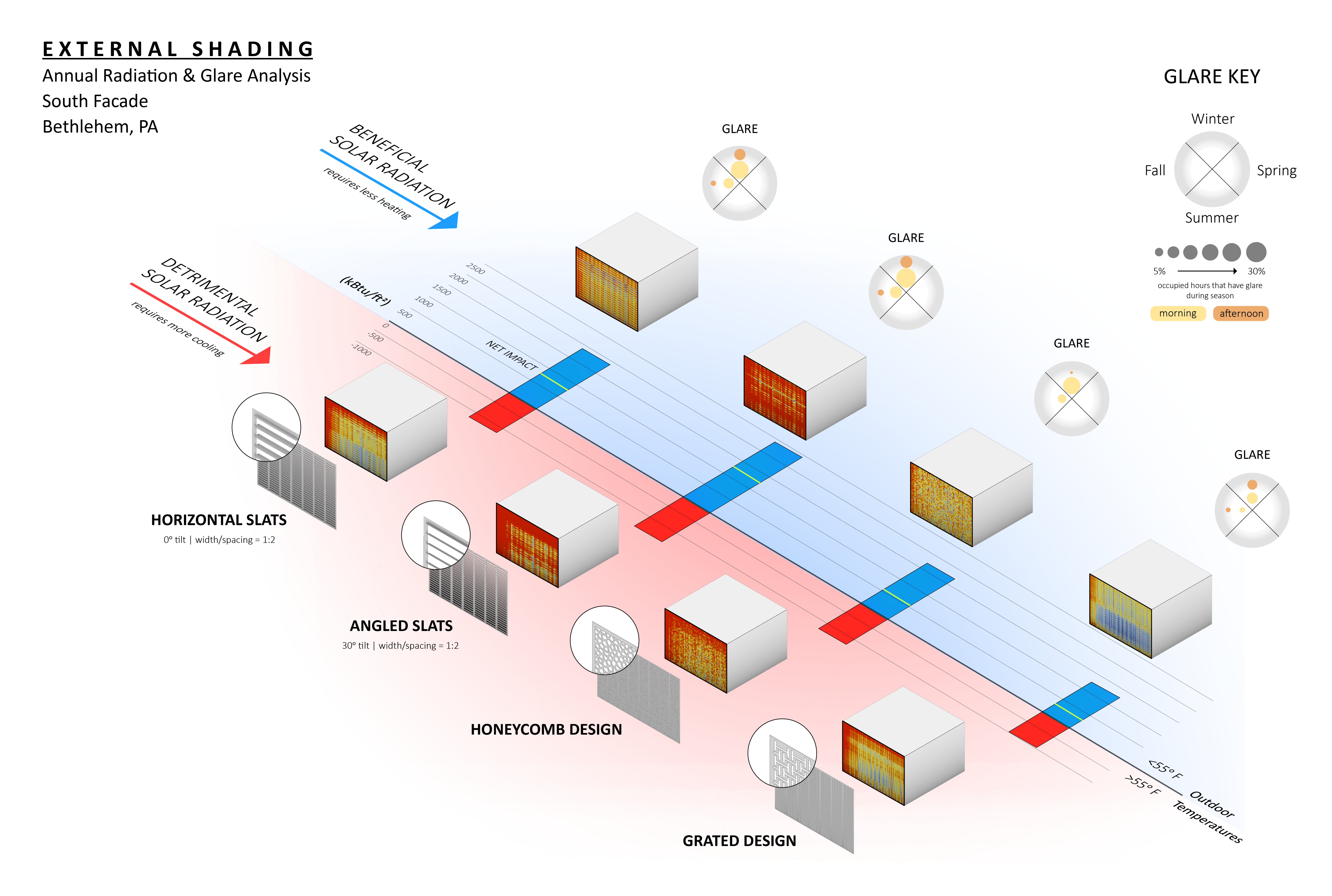 This graphic aided in a big step forward to investigating not only the sustainability and energy consumption impact of external shading design but also considering the resulting occupant comfort within the space. Producing this graphic demonstrates the balance involved with finding a design solution that allows the building to use passive solar heating while maintaining comfortable occupant conditions. Having the results shown side by side allows designers to directly compare the performance of the different designs based on the priority of their project whether that be energy reduction or glare management.