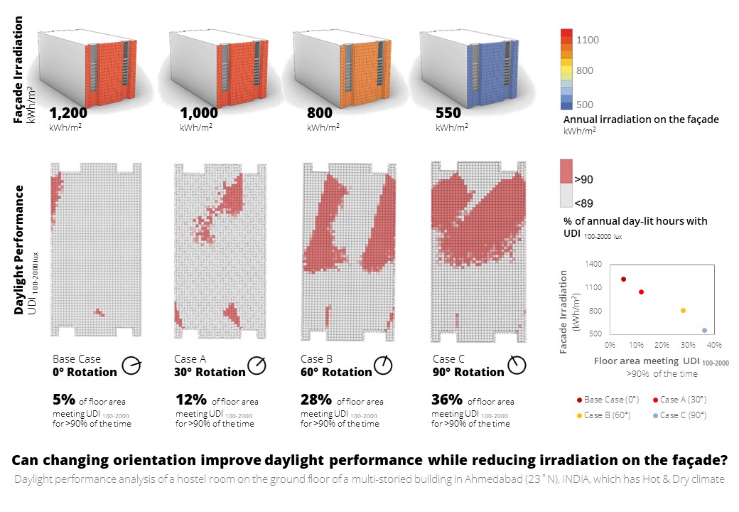 What is the impact of orientation on daylight performance and irradiation on the façade?