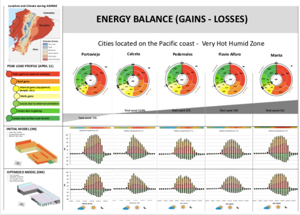 What is the impact of climate and ubication on the energy balance of an initial model versus an optimized model of customer service agencies?