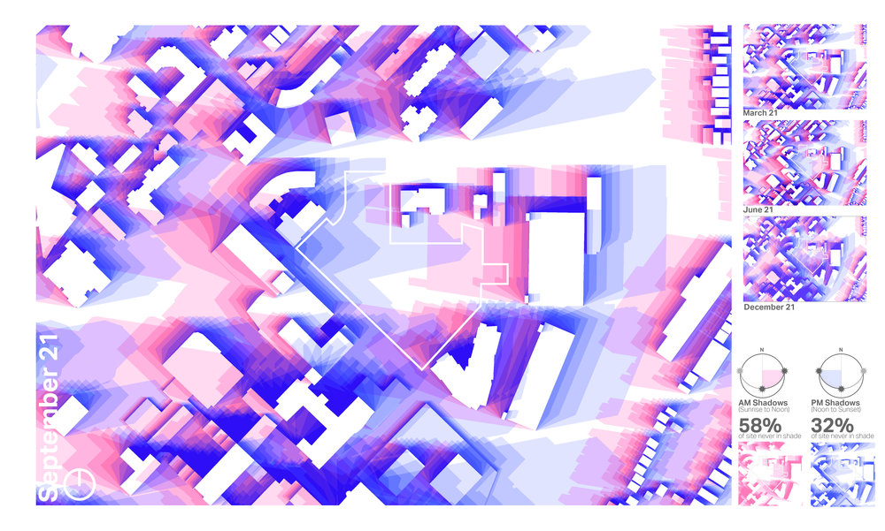 What is the impact of context shadows on community park’s solar access and new landscape design?