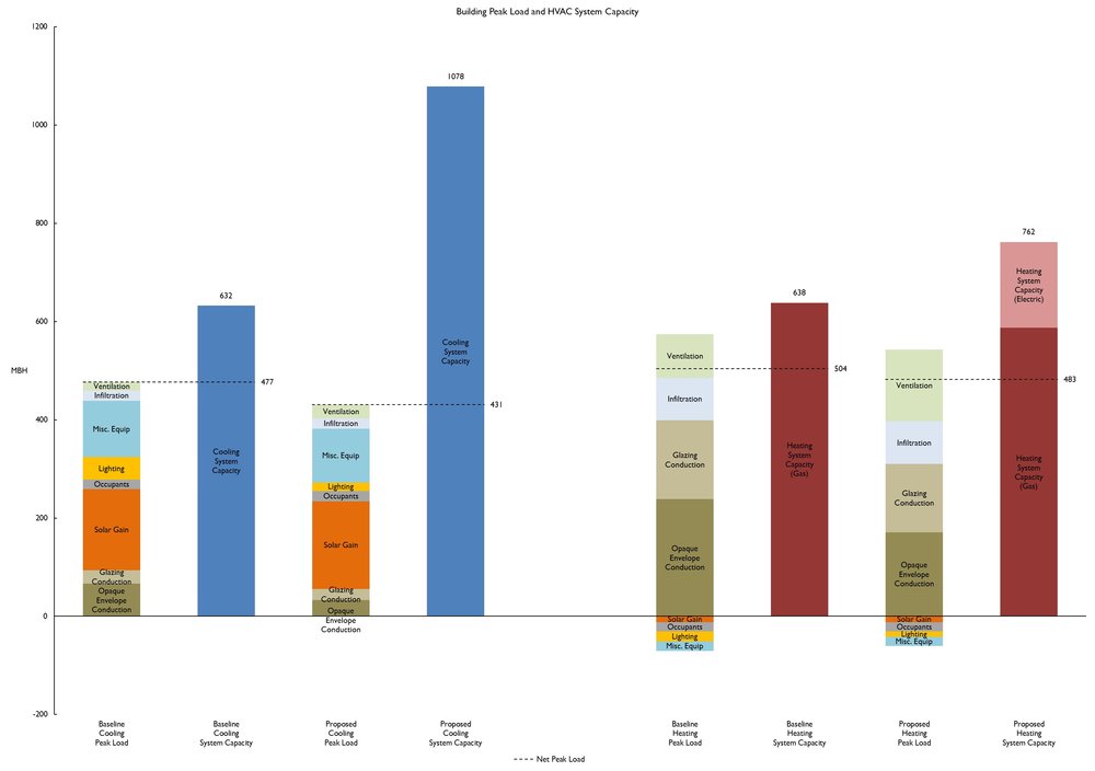 What is the impact of energy conservation measures (ECMs) on peak heating and cooling loads?
